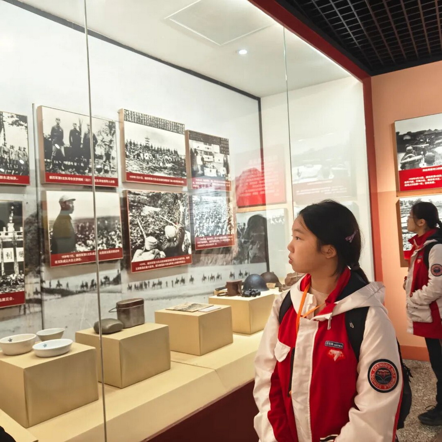 广场上鲜红的手掌印,仿佛先烈们铿锵的誓言。同学们轻触印记,缓步入馆,在讲解中聆听历史回声。从抗战文物到革命书信,每一件展品都是一段鲜活的历史,大家无不肃然起敬,凝神记录。