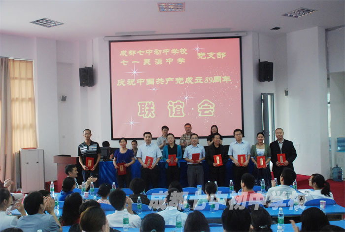 沉浸在灾后重建巨大成就的喜悦中,两校全体党员老师来到新落成的七一聚源会议室举行建党89周岁纪念活动。活动在简洁、庄重的氛围中缓缓推进,成都七中初中学校党支部书记李笑非同志首先讲话,她深情地向我们伟大的党89年周岁生日表示诚挚的祝贺,祝贺我们在党的领导下灾后重建取得的伟大成就;她热切希望全体党员、干部在“创先争优”活动中,增强宗旨意识、责任意识和先进性意识,努力以校训“审是迁善,模范群伦”鞭策教育行为,创造最适宜学生的教育,创办让人民满意的教育;她希望两校党员、老师密切联系,加强交流,促进友谊和工作再上新台阶。成都七中初中学校杨斌校长宣读两校优秀党员名单,我校张新民、王岚、刘家永、王翔宇、吴旭光、李永川、徐夕明、曾畅畅、左强九名优秀党员受到学校党支部表彰,都江堰市七一聚源学校党支部书记陈刚校长为优秀党员颁发荣誉证书并讲话。