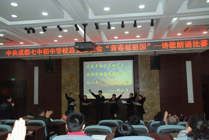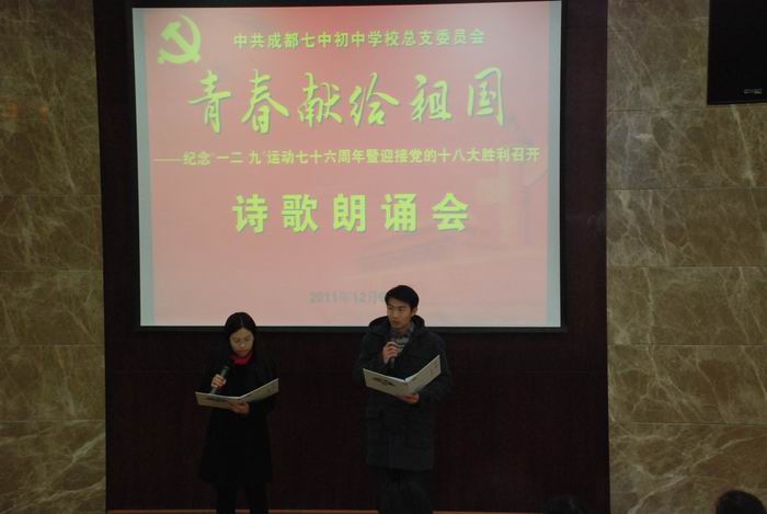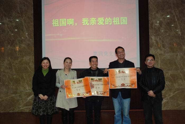 学校党总支于12月6日中午在学术一厅举行了“青春献给祖国”——纪念“12•9运动”七十六周年暨迎接党的十八大胜利召开诗歌朗诵会。四个党支部的党员老师精心组织和准备,用自己饱满的深情,动人的声音来歌颂祖国,表达甘用“青春献祖国”的壮志豪情。八组朝气蓬勃的青年党员,八段关于铭记历史的动人故事,凝聚成一个共同的声音“铭记历史,展望未来”。历史组张力生老师朗诵的著名女诗人舒婷的《祖国啊,我亲爱的祖国》、语文组全体党员老师带来的声情并茂的朗诵《我们伟大的祖国》以及数学组全体党员老师的《我的祖国》,获得大赛评委的一致好评,夺得了一等奖的好成绩。