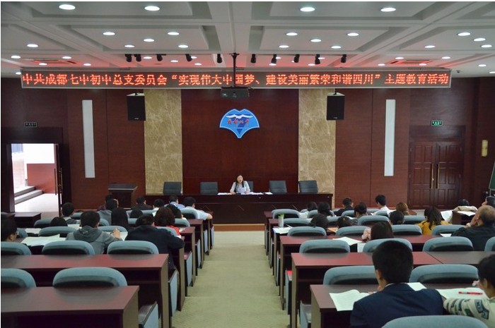 2013年5月17日13:00,成都七中初中学校召开了全校教职工参加的主题教育活动启动会议,安排部署了“实现伟大中国梦、建设美丽繁荣和谐四川”主题教育活动相关工作。