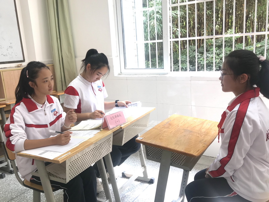 2019年9月27日,终于迎来了面试的这一天。面试现场,一边是一本正经的小考官们,另一边是焦急等待的同学们。虽然很紧张,大多数同学们都有备而来。一说自我介绍,便流利得让老师和小考官们记忆犹新。一说设计艺术字,一个个都成了艺术家的化身,潇洒的一挥,豪迈的字彰显出七初情。面试问题更是考验同学们的责任心,比如1.什么是学生干部?学生干部具备的素养有哪些?
