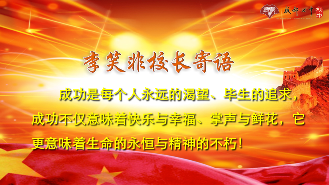 初三的底色是奋斗,奋斗的日子是令人喜悦而充实的。成都七中初中学校党总支书记、校长李笑非老师深情寄语初三学子,成功是每个人永远的渴望,毕生的追求;成功不仅意味着快乐与幸福,掌声与鲜花,它更意味着生命的永恒与精神的不朽。李校长的祝福点燃了莘莘学子奋进的激情。同学们定当奋力拼搏,一展七初学子的壮志豪情!
