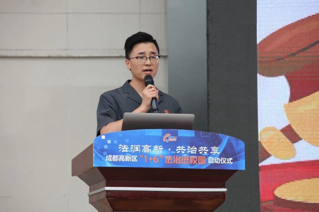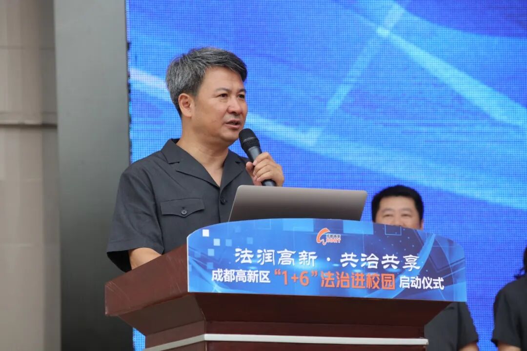 成都高新区党工委政法委专职副书记、应急管理局樊晓峰局长致词。樊局长指出,目前培养“学法”、“遵法”、“守法”的公民,营造绿色健康的校园氛围具有紧迫性,因而推行“1+6”法治活动进校园具有重大意义。他强调“1+6”即一名专项辅导员加六项法治活动,为推动活动落实,樊局长提出三点希望:一是贴近学校,切实做好法律教育活动;二要精准问需,扎实做好法律教育活动;三要强化联动,着力形成法律合力。樊局长号召共同创建高新区独有的法治名片,争取获得令人瞩目的新成就。