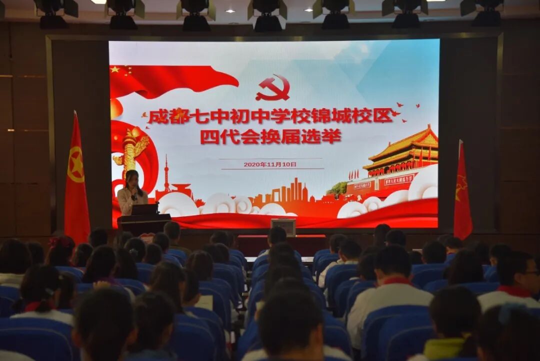 2020年11月4日中午,成都七中初中学校锦城校区2020年学生四代会换届选举在学术厅隆重召开。团总支、大队部、学生会、社团联合会的全体同学和班级代表们,学生成长中心全体老师和校区领导共同出席了本次会议。成都七中初中学校锦城校区大队辅导员周兰老师主持会议。