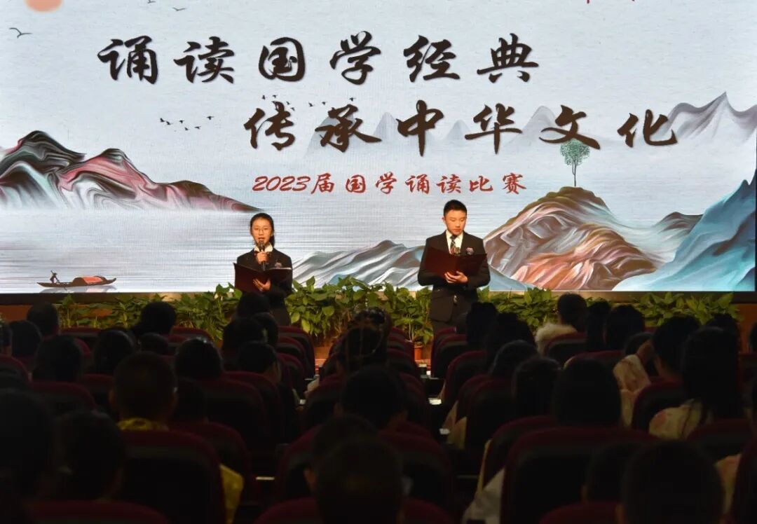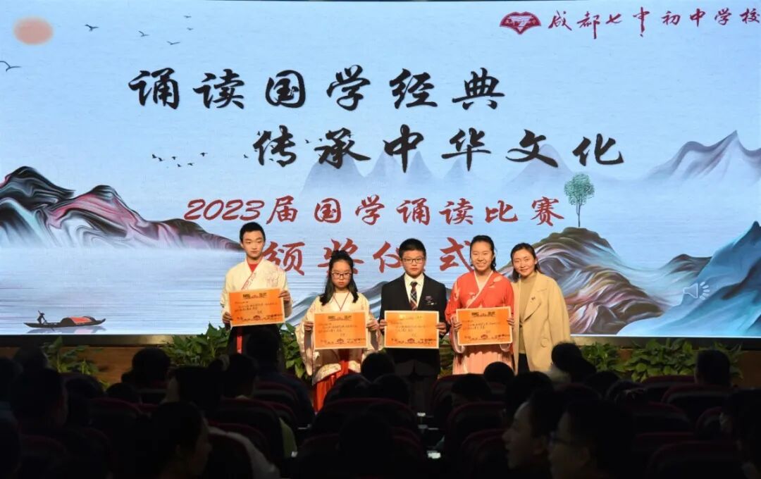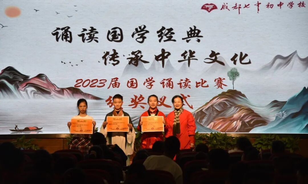 11月30日,成都七中初中学校锦城校区举行了2023届“诵读国学经典·传承中华文化”的国学诵读比赛。成都七中初中学校副校长王岚老师、校长助理孙余老师、锦城校区教师发展中心主任王子文老师、信息中心主任廖维老师、课教中心副主任郭萍老师、学生成长中心副主任黄西林老师、行政办公室副主任谢晴老师和2023届的全体师生及部分家长出席了本次活动。比赛邀请到语文组特聘指导专家何玲老师、语文教研组组长杨燕红老师、八年级语文组李延刚老师、九年级语文组刘小丽老师、学成中心大队辅导员周兰老师担任评委。