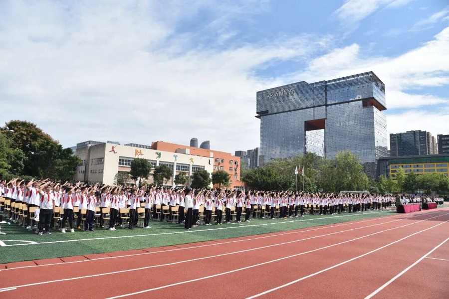 在锦城校区,成都七中初中学校党委委员、副校长吴旭光从中国五千年文明史谈起,回顾了中华文明繁荣昌盛的光辉历程,并谈到近百年的民族屈辱以及新中国成立以来从站起来、富起来到强起来的伟大飞跃。吴校长鼓励七初学子,立凌云之志,修过硬之能,铸自信之魂,扬创新之风,怀天下之情;勉励全校师生作新时代的追梦人,把个人的追求融入党和国家事业之中,铸就精彩人生!