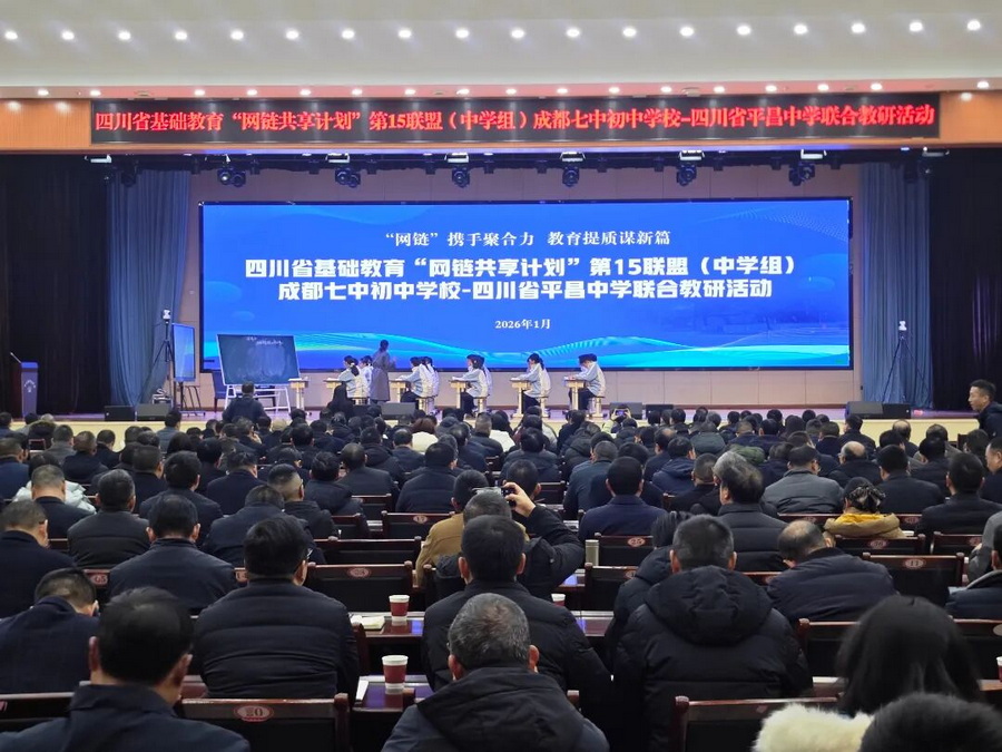 1月6日,四川省基础教育第15联盟(中学组)线下联合教研活动在四川省平昌中学开展。本次活动由成都七中初中学校与平昌中学联合主办,我校行政干部及骨干教师团队与来自巴中市、县(区)教育主管部门负责人、教研专家,以及来自巴中市近百所中小学的校长、教学负责人与骨干教师代表等数百人齐聚一堂,共同参与这场跨越地域的教育智慧交融与创新实践。
