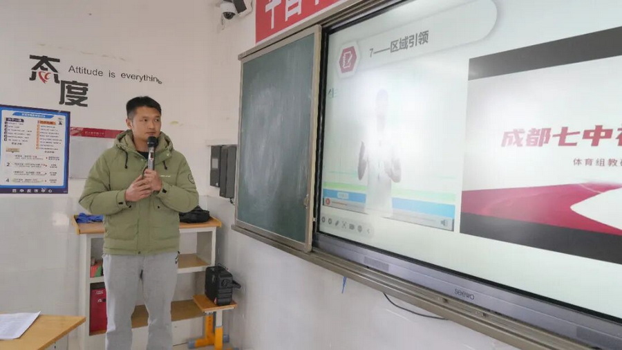 成都七中初中学校体育教研组组长漆龙老师作了题为《挖掘体育内涵,赓续七初精神》的分享。他就学校体育课程建设、教师团队发展、体育工作重点的实践经验做了介绍,并分享了学校体育教学的价值追求。